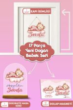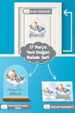 Kişiye özel hazırlanan uyuyan ayıcık temalı 17 parçalık yenidoğan bebek süs seti, hastane odası ve ev karşılamaları için mükemmeldir.