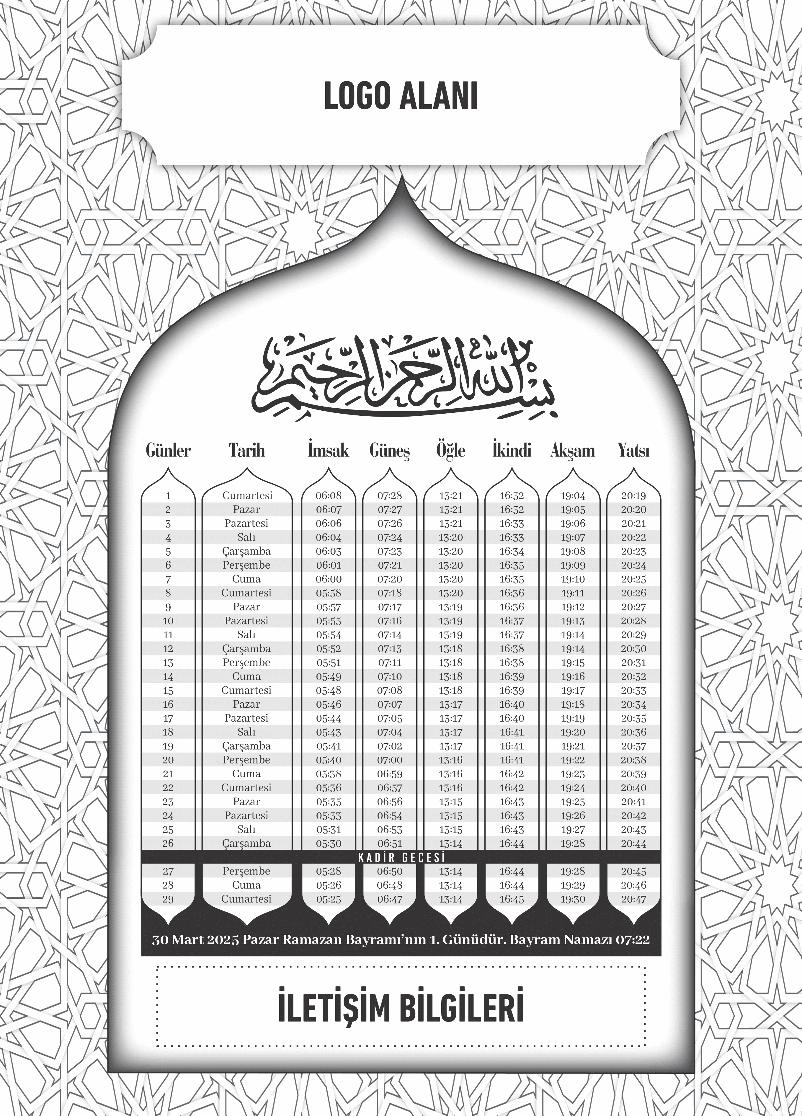 ✅ İmsakiyenin üst orta kısmında asmak isteyenler için delik bulunur